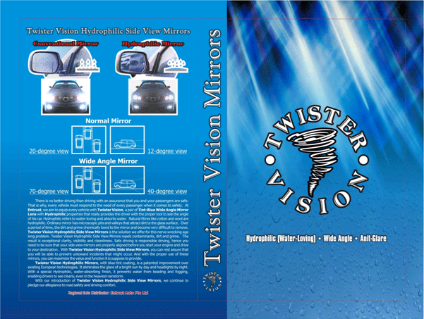 Twister Vision Tint Blue Wide Angle Hydrophilic Side View Mirrors have never been available in the world until now and the technologies used in designing and manufacturing these remarkable mirrors are patented in the United States, Japan, and Taiwan, and certified in Europe.