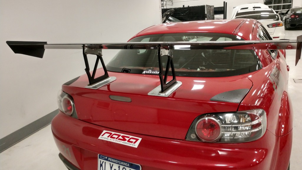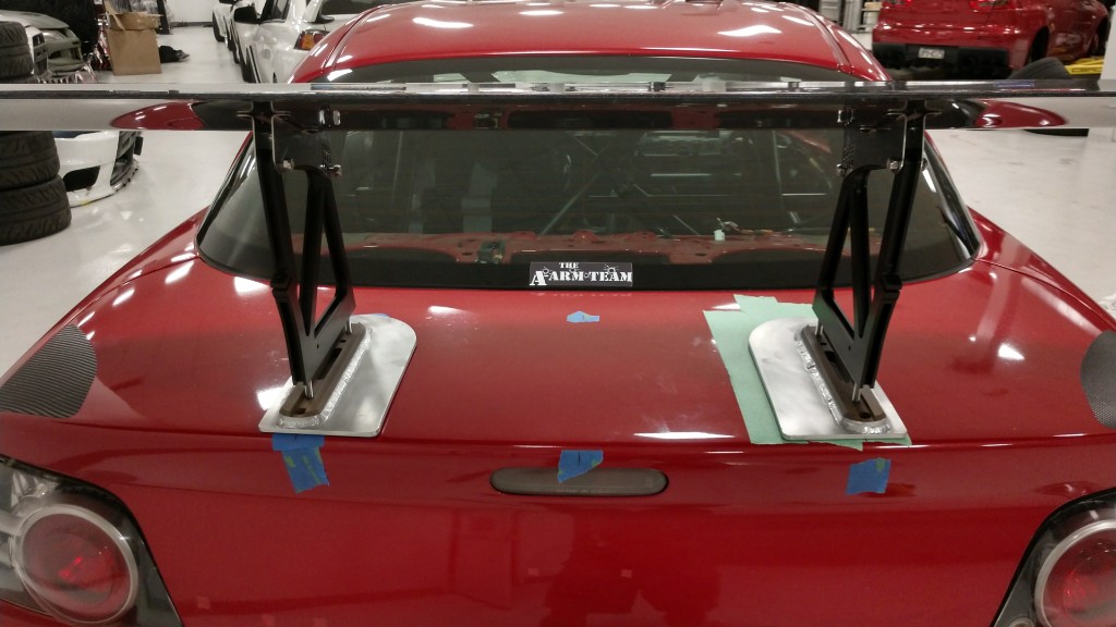 Got rear wing mounted. I went with aeromotion since I used one on my Evo and liked it, very low drag and we are also a vendor for them. They recommend using the one with the stands that's closest to the center as possible, since the outer edge of the wing is where it's most efficient from clean air. I had to make custom base plates to spread the load. I drew out the design and my buddy Chad from CBRD had them cut and he welded the stands on.