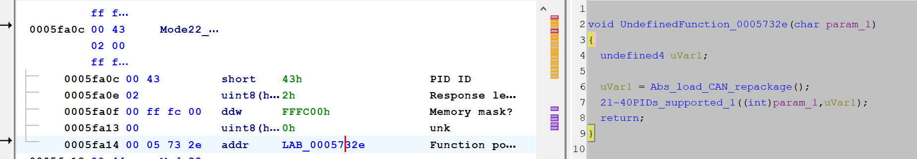 For the Mode22 PID 0x43: This is the function it uses, and it just returns the value as we calculated above unless the injectors are off, in which case it returns 0: