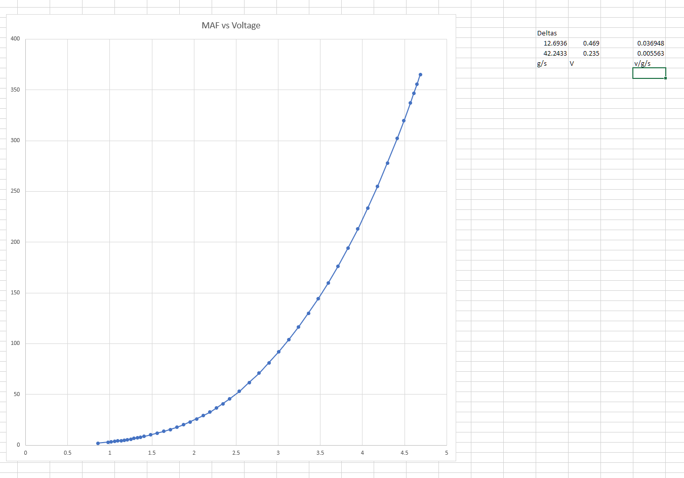 Based on the MAF scaling in the module, at lower flow rates, you get a ~.5V differential for 12g/s delta. At higher flow rates, you have a ~.2V differential for 40g/s delta. The voltage per g/s is very small at these higher airflows, about a factor of 10 less sensitive, and it is not simple to detect small changes during sensor saturation.