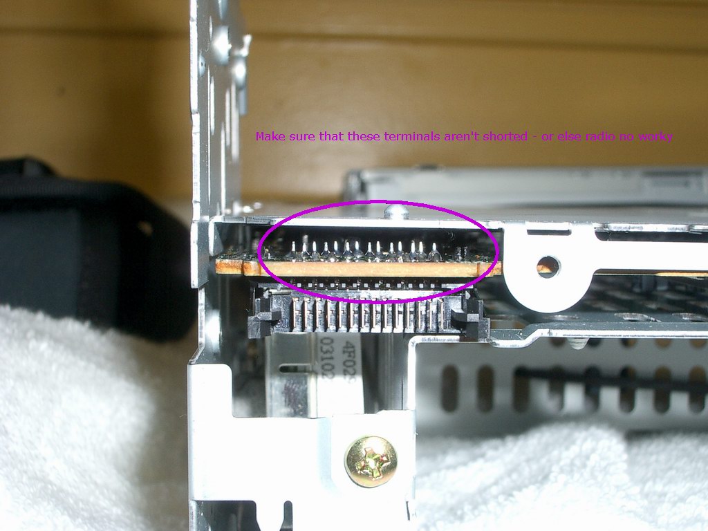 (Also - make sure the metal cover on the radio doesn't short out the pins that connect all of the console buttons - luckily this doesn't damage anything, just prevents the display, and any button but eject from functioning)