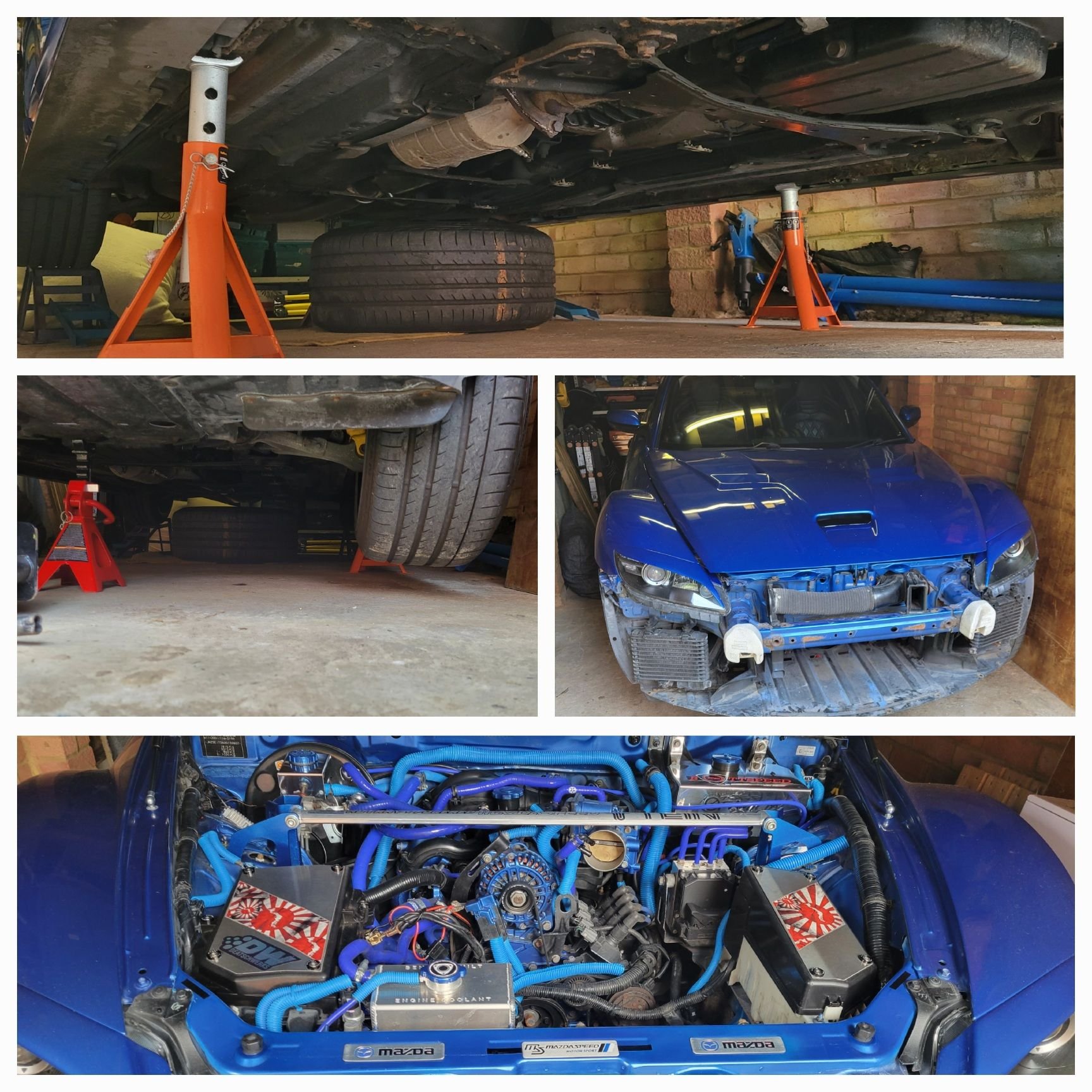There's no time like the present. Thought I would get everything ready before next weekend. Installed the new spark plugs, removed the engine mount bolts and front bumper, jacked the car up and put it on stands, and also removed the battery and airbox. Garage space is limited, but I think I'll have enough room to work in the wheel well and under the car
