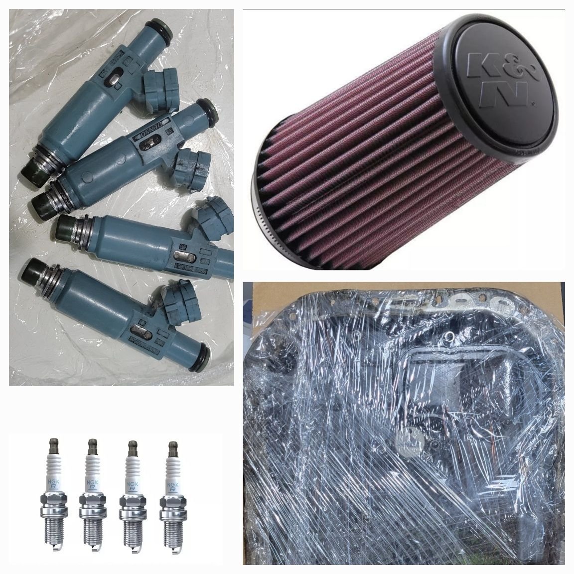 I bought some used blue injectors and a used sump, a K&N air filter, a 90 degree 3.5" pipe for connecting the air filter to the homeycomb MAF tube, a 45 degree 3.5" to 3" silicone reducer, a 3" pipe with 32mm T connector for connecting to the recirculation valve, and four new R7420-9/6448 spark plugs.