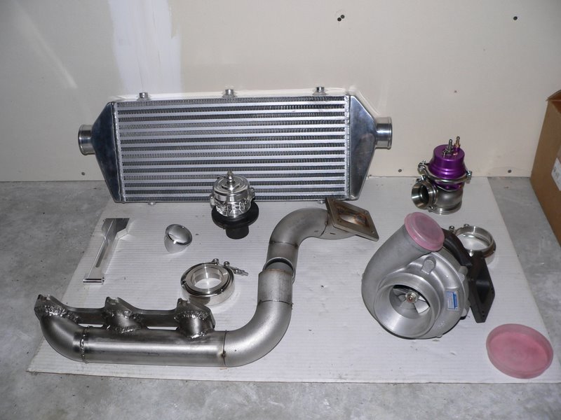 looks like the turbo could be a T04R.........maybe a 60-1 trim T4....... rather large FMIC, possibly perrin or somethin along those lines........looks like a "custom" made exhaust manifold, like a turbonetics knockoff wastegate, n rather large ricey blowoff valve lol