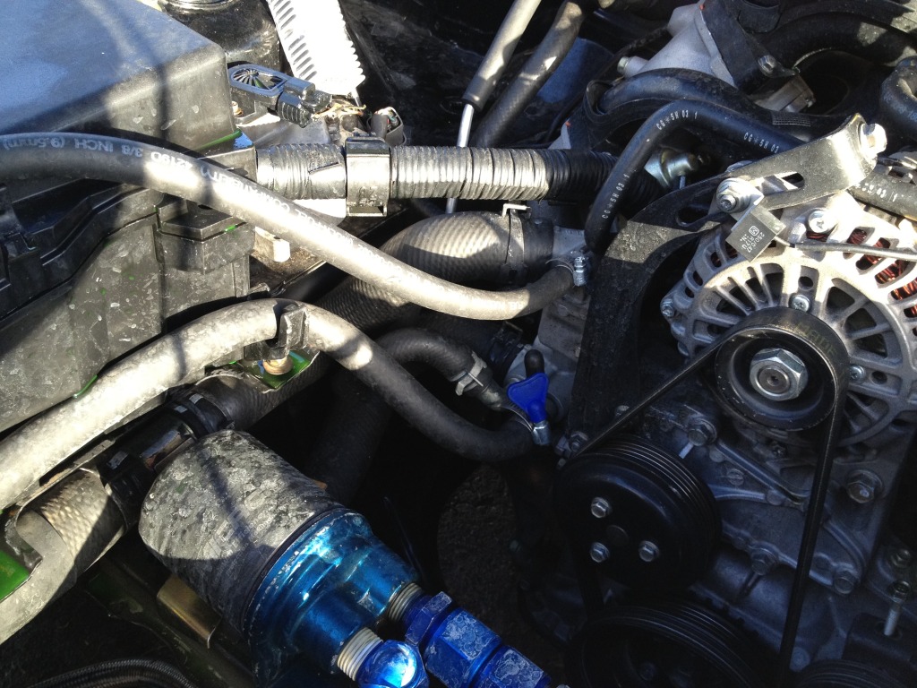 There is a coolant line from the back, top, pasenger side of the motor, that connects to the front near the thermostat.