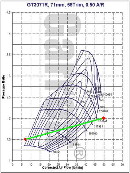We have since seen a number of compressor maps. The 2 of interest to me are the GT3071R and the GT3582R.