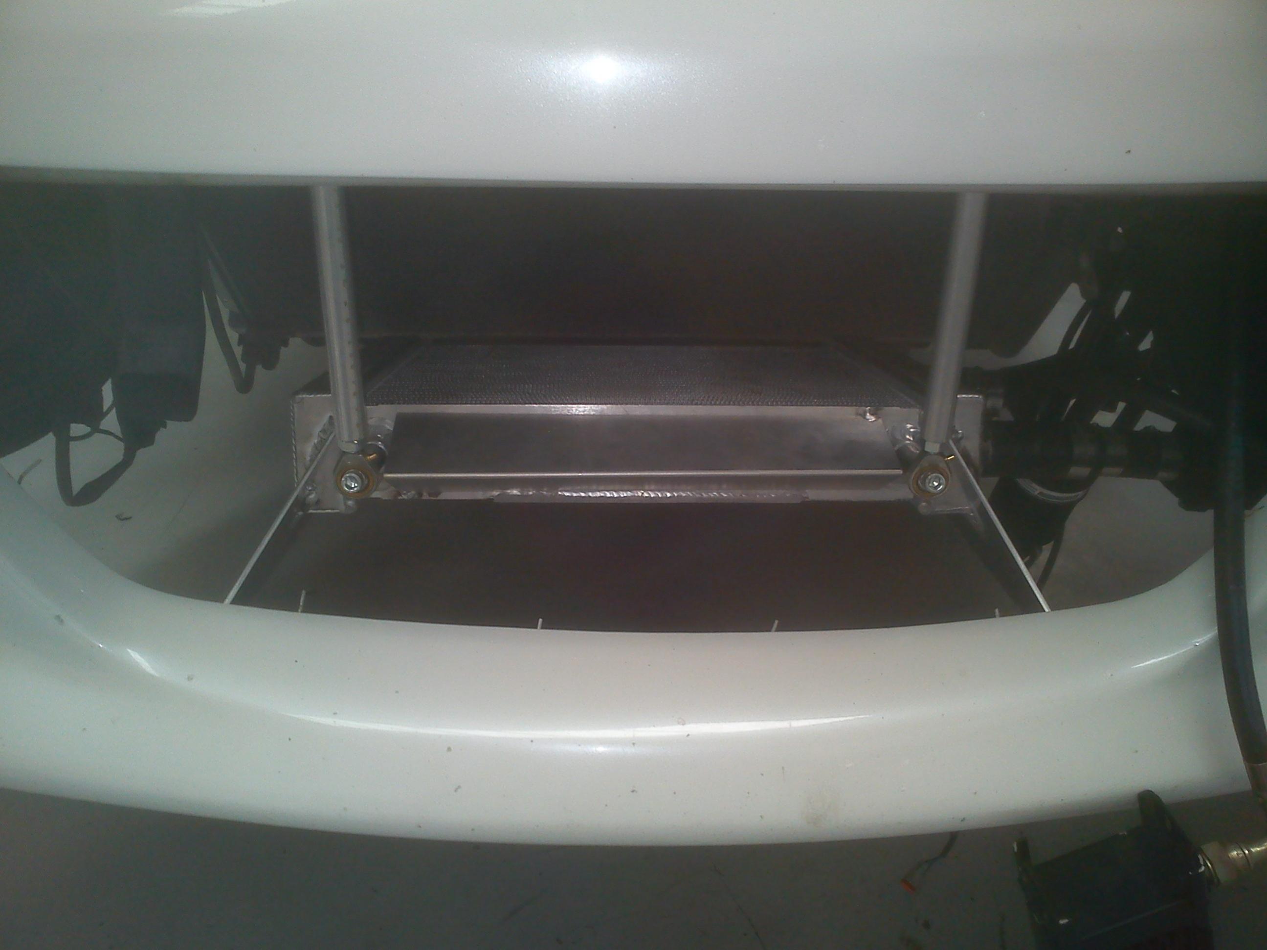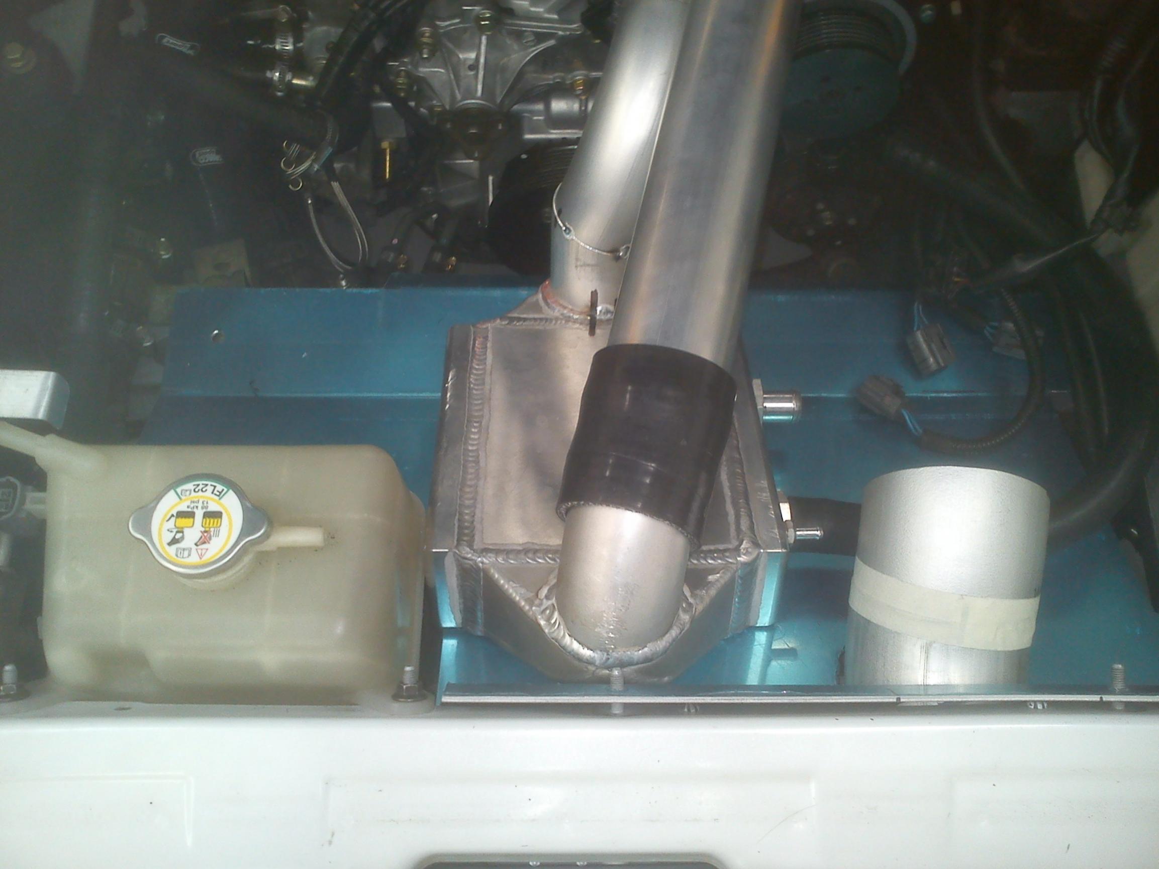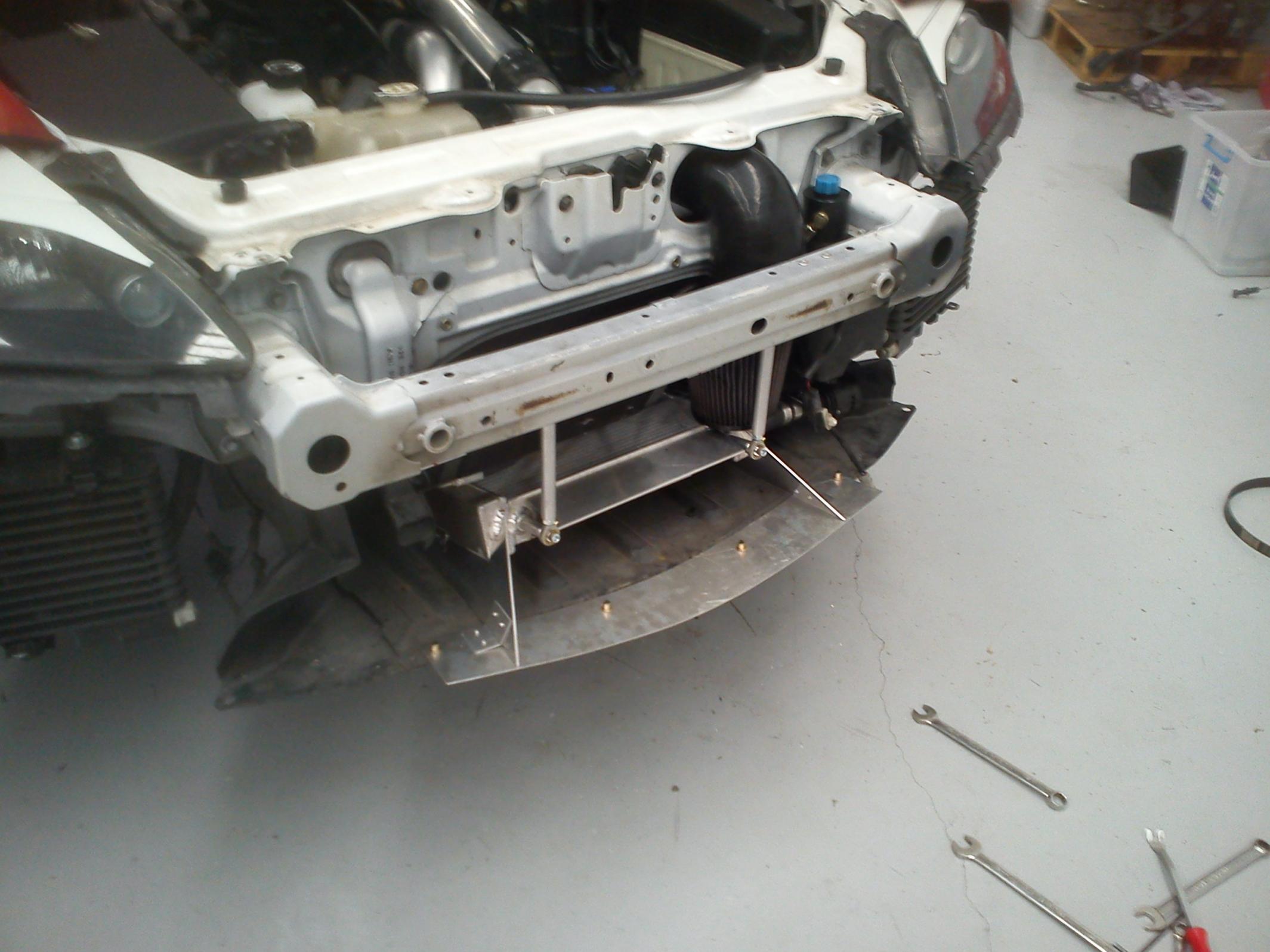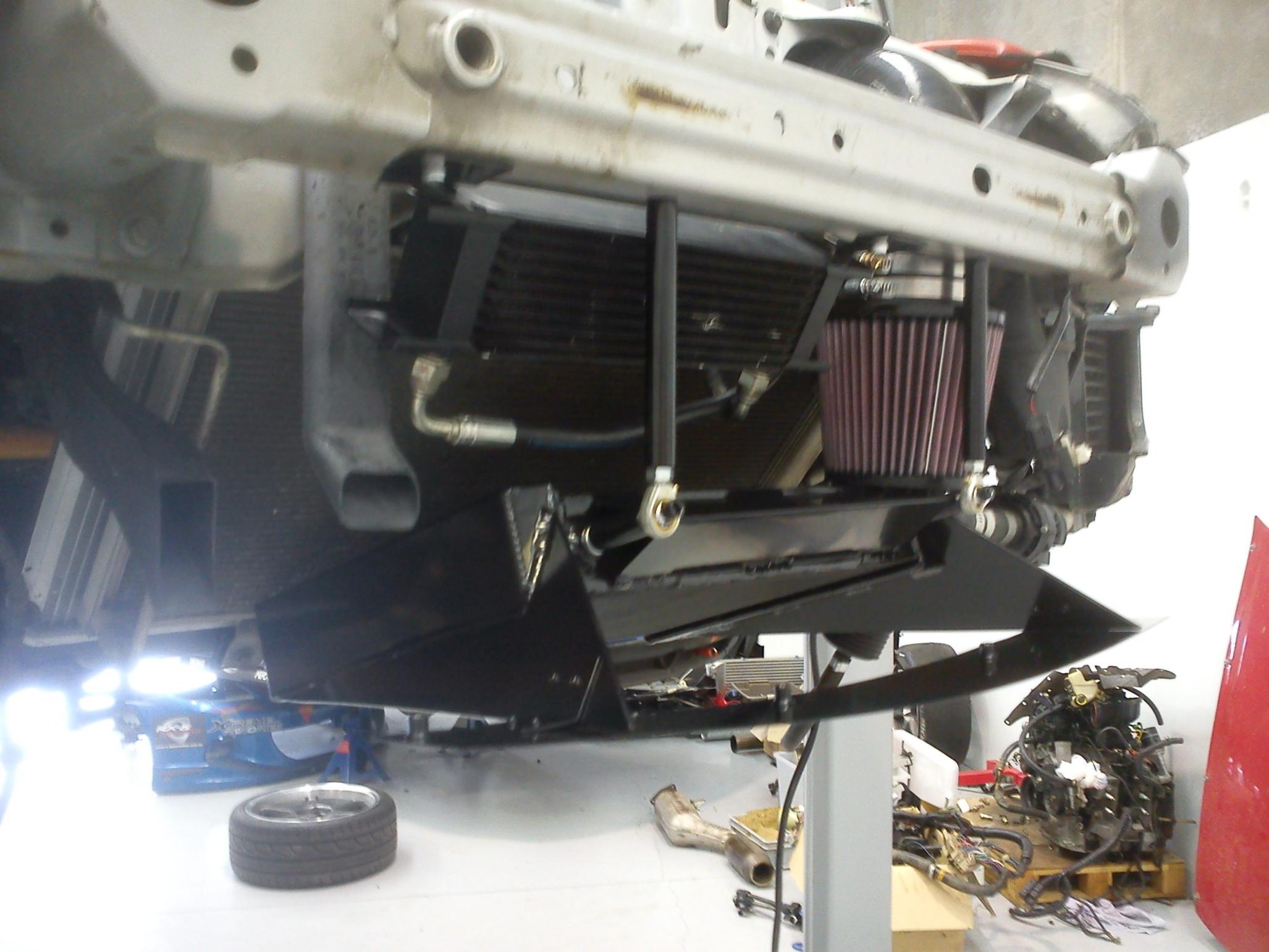 -Custom aluminium tray covering intake piping and OEM battery location (where SOHN bottle is now), allowed for brackets to be made to hold IC core, diverting fan heat