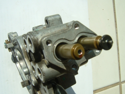 So here’s how it works. In the attached figure you see all diameters of all pistons sucking up oil from the oil gallery. As the cylinders are simultaneously rotated 90 degrees and pushed towards the cylinder, the angled holes come in line with say drilled holes leading to #2 and #3 outlets, both above and below the check valves. Further rotation of another 90 degrees and retraction of the cylinders brings the other side of the cylinder inlet holes into contact with the oil gallery for sucking up oil. Another cycle and outlets #1 and#4 receive oil. Each outlet is assured its share of oil.