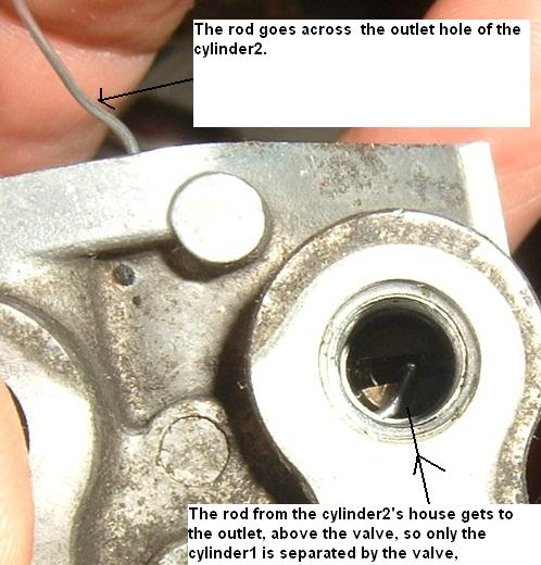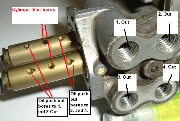 Notice that the outlet of the cylinders that connect to outlets 1 and 3 are fed only from the big diameters of both pistons - SPBD and BPBD. Outlets 2 and 4 are fed by the small diameters of both pistons SPSD and BPSD. Therefore outlets 1 and 3 will always receive more oil that outlets 2 and 4.