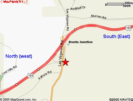 Take the 101 North - Exit: Las Virgines, make a LEFT, then proceed straight over the bridge. You will see the Mobil station. I promise you cant miss it. There isn't much there except a few other gas stations and a shipping center further down.