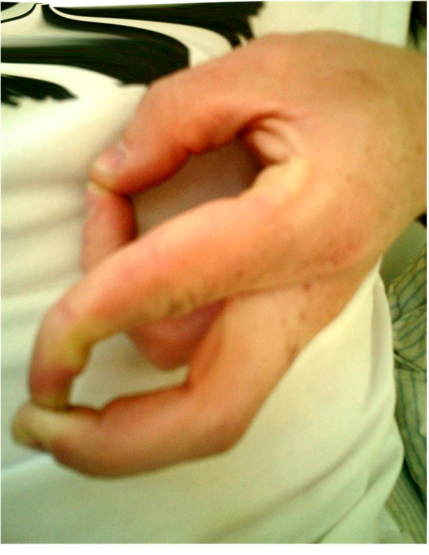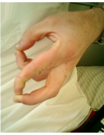 That would be four fingers held up on each hand, thumbs held in towards the palm. :D
